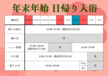 今年も残すところあと半月となりました。 年末年始の日帰り入浴と、飲食店・商店の営業日&営業時間をまとめましたので、ぜひご覧ください! 年末年始は土湯温泉でゆったり年越し、いかがですか?😊